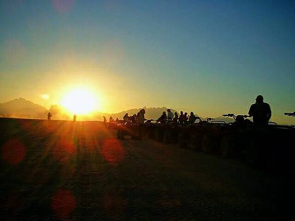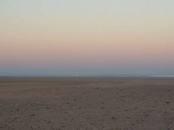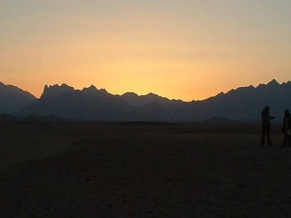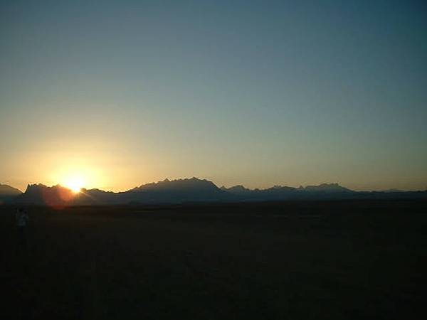 夕陽漸漸在沙漠的天際線落下,由層層的七彩色澤轉變為橘,映照著不知是山還是沙丘。